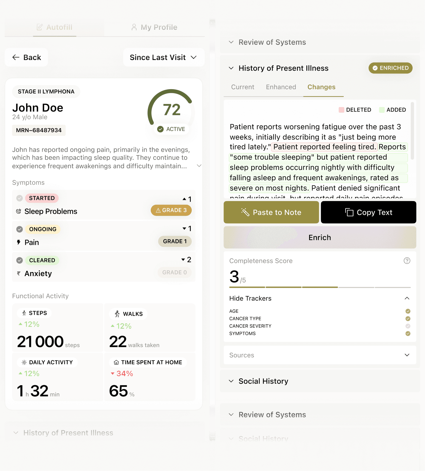 Automate the creation of clinical notes and E/M coding. Our Autofill feature synthesizes weeks of patient data into structured, AI-drafted narratives directly in your EMR.